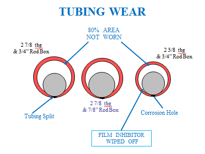 This wear action is very important, because it is often the culprit of several types of failures: (1) tubing splits, (2) corrosion holes & pits, (3) rod